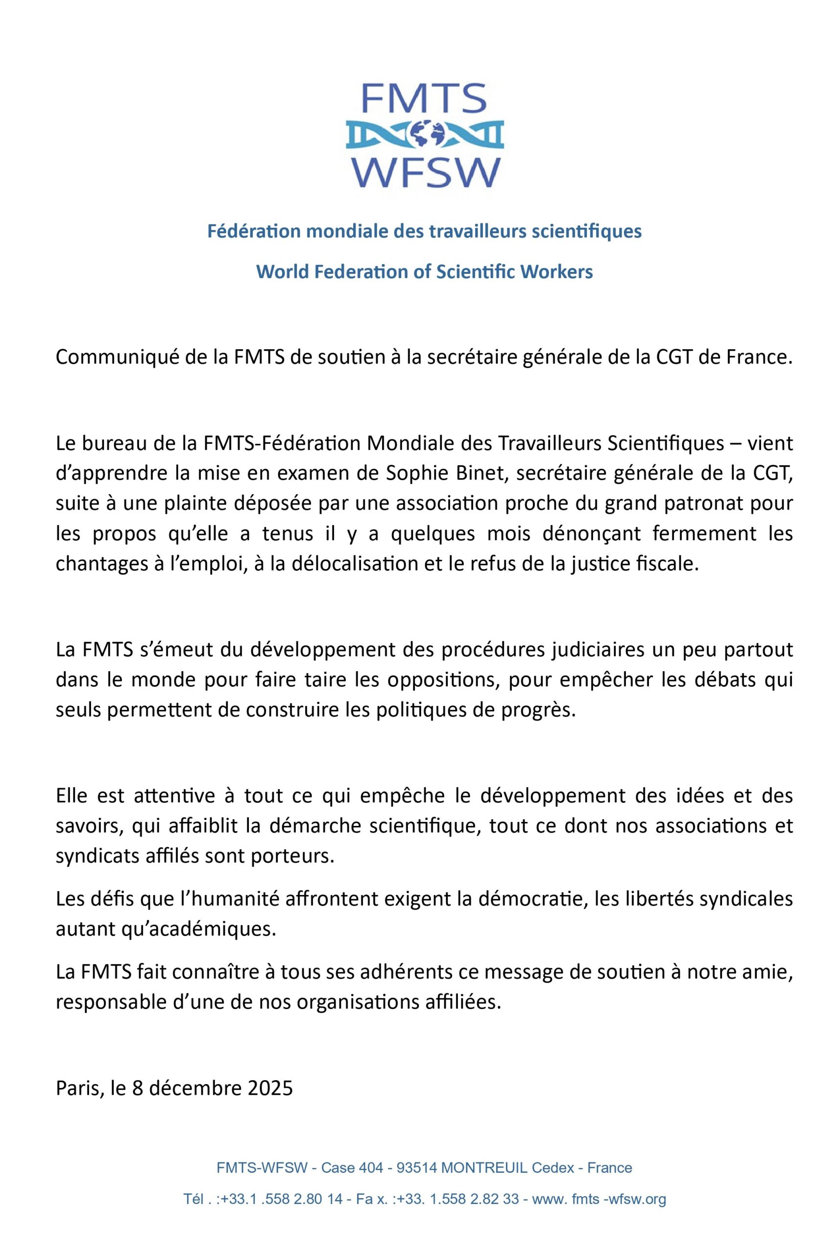 Continuer la lectureCompte rendu de la Présidence98e Réunion du Conseil Exécutif de la Fédération Mondiale des Travailleurs ScientifiquesParis, France, 9–13 juin, 2025