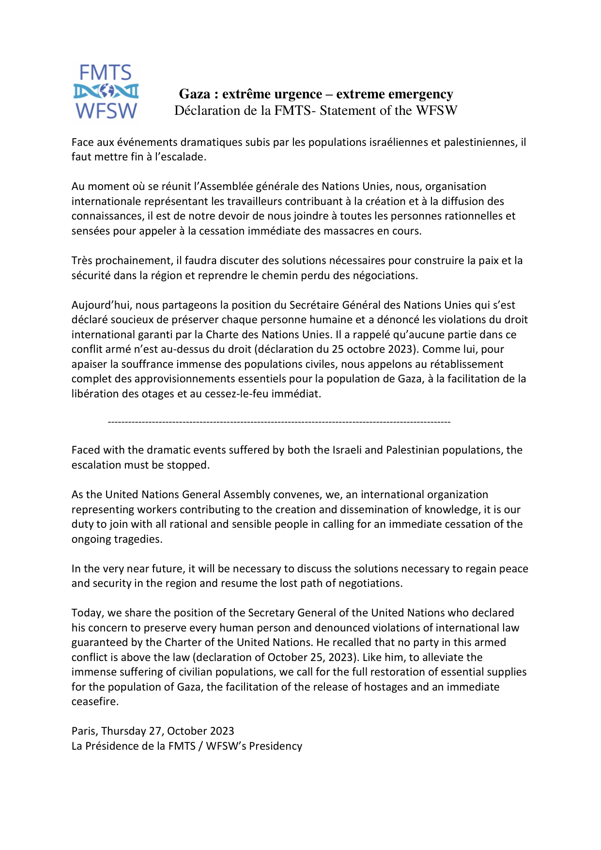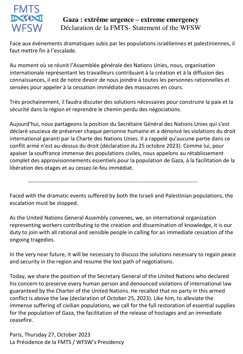 Pdf document (Anglais – Français – Espagnol – Portugais): 231024 Oceans Declaration WFSW